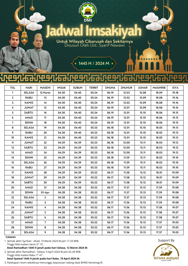 Cibarusah – Menyambut Bulan Suci Ramadhan 1445 H, Dewan Mesjid Indonesian (DMI) Kecamatan Cibarusah hadirkan Jadwal Imsyakiyah untuk wilayah Cibarusah dan sekitarnya.
